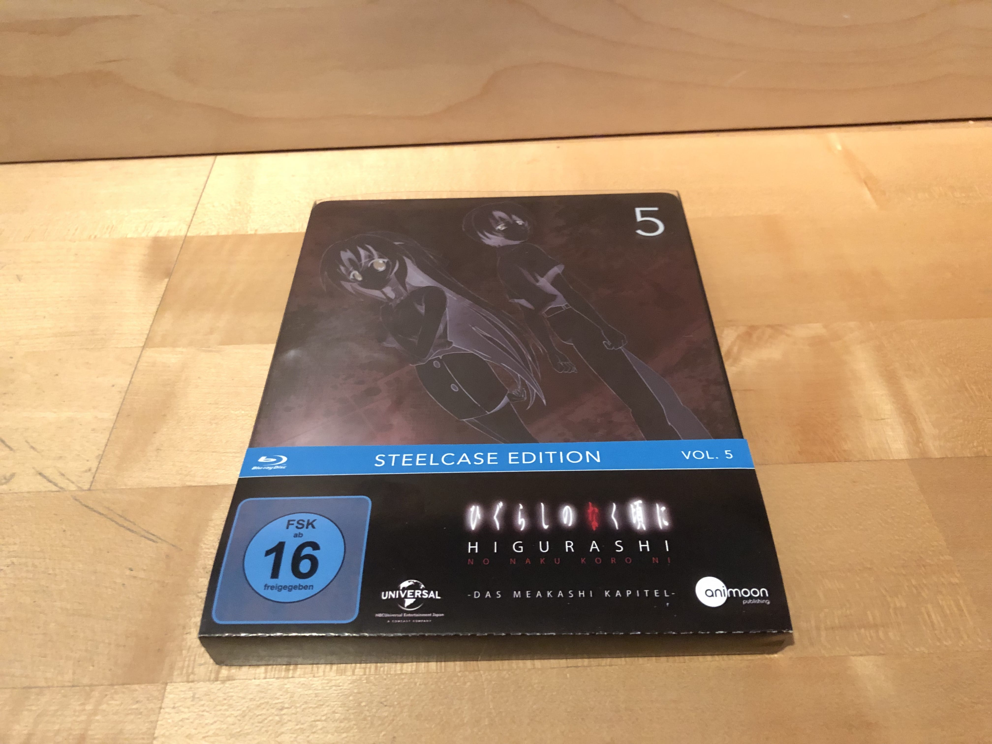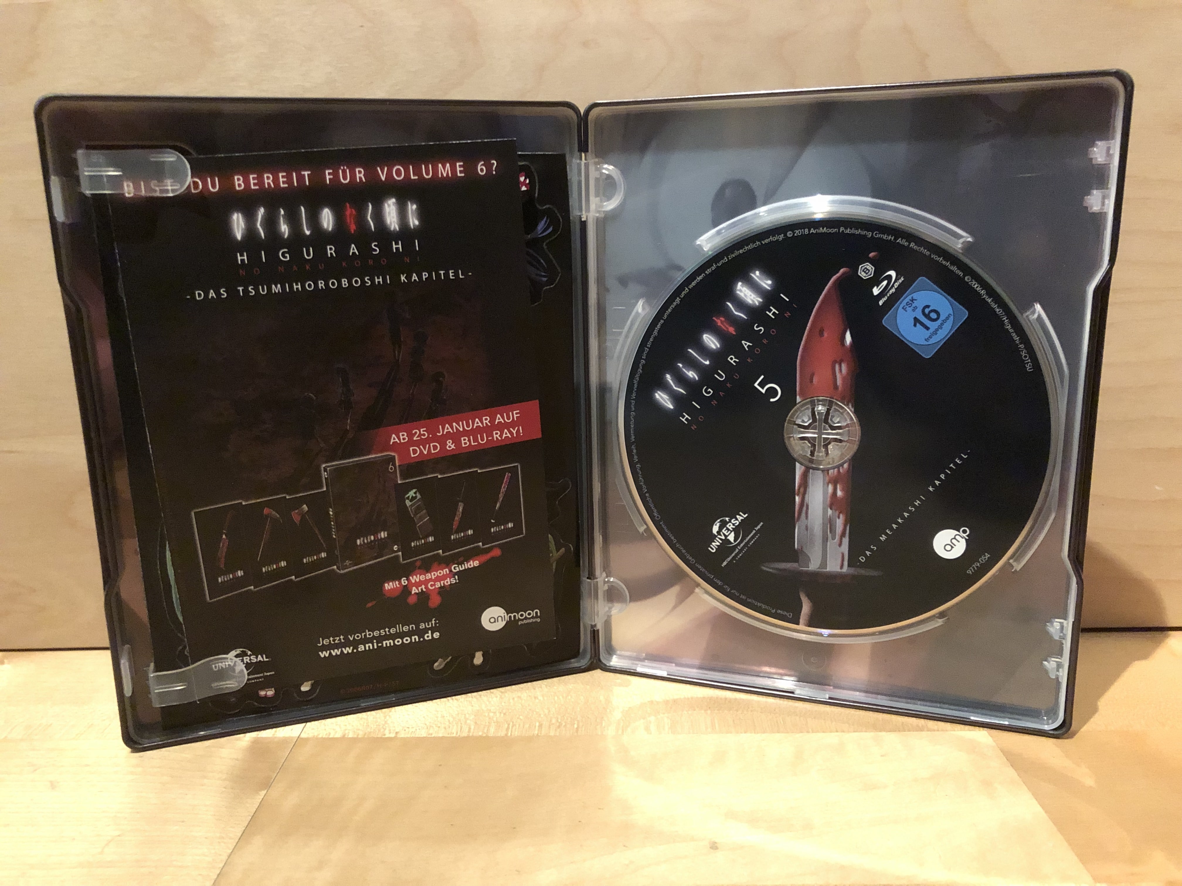 Genau wie bei unseren weiteren Rezensionen hat die physische Umsetzung des Produkts keinerlei Einfluss auf die Gesamtwertung unserer Review. Dennoch möchten wir euch als potenziellen Käufern ein Bild von dem vermitteln, was euch bei einem Erwerb erwartet. Die nachfolgenden Informationen und Bilder beziehen sich dabei auf die limitierte Blu-Ray-Version des fünften Volumes von „Higurashi – Der Gesang der Zikaden“.