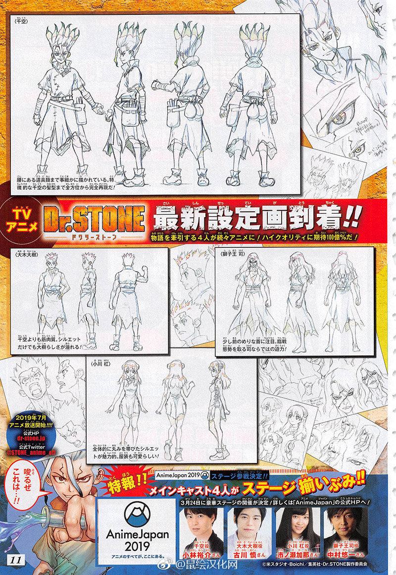 Auf der offiziellen Webseite zur kommenden Anime-Adaption von Riichiro Inagakis und Boichis Manga „Dr. Stone“ wurden nun die ersten Charakterdesigns enthüllt.