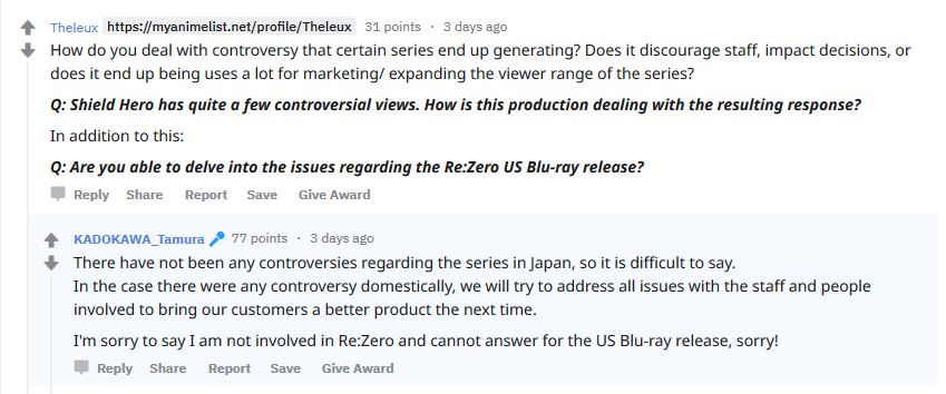 Tamura, der unter anderem bei „KonoSuba“, „Re:Zero“, „Youjo Senki“ und „Overlord“ mitwirkte, nahm auf Reddit an einem AMA (Ask Me Anything) teil und stand den Fans Rede und Antwort. Dabei kam die Frage auf, inwiefern Kontroversen, wie dies bei ,,The Rising of the Shield Hero“ oder ,,Goblin Slayer“ der Fall war, Einfluss auf die Anime-Produktion haben.