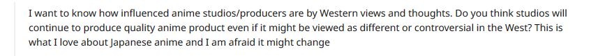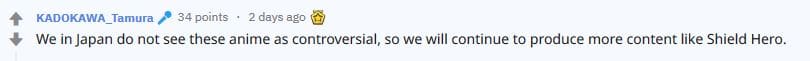 Eine konkrete Antwort auf diese Frage konnte der Produzent nicht liefern, da die genannten Serien in Japan, im Gegensatz zum Westen, keine Kontroversen auslösten. Allerdings betonte er, dass solche Probleme erst angegangen werden, sobald sich japanische Fans beschweren sollten. Laut Tamura soll damit sicher gestellt werden, dass die zukünftigen Produkte den Wünschen der Fans entsprechen. Darüber hinaus fügte er hinzu, dass man sich nicht durch solche Kontroverse entmutigen lassen wird. Stattdessen werde man weiterhin Serien, wie ,,The Rising of the Shield Hero“ produzieren.