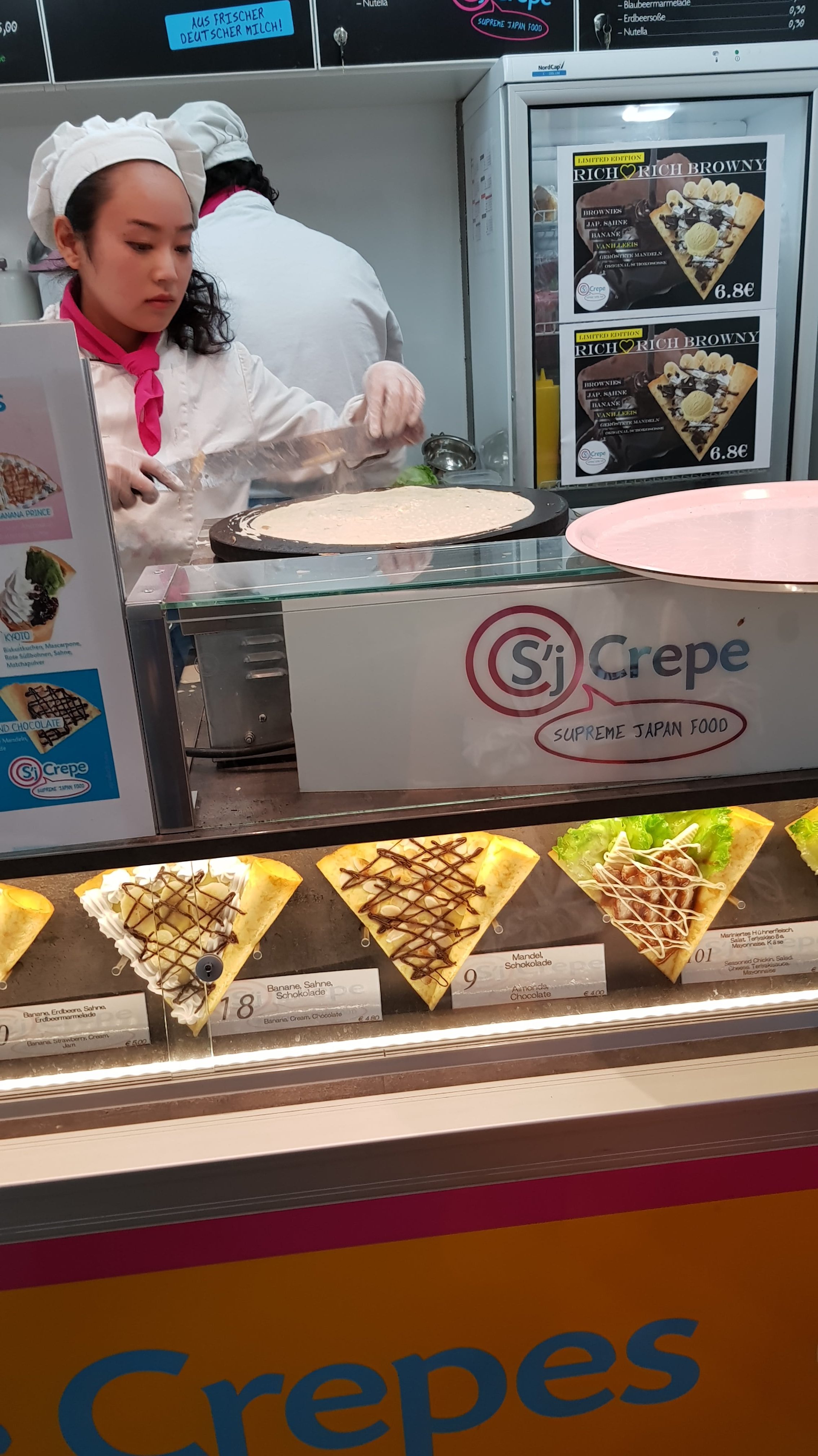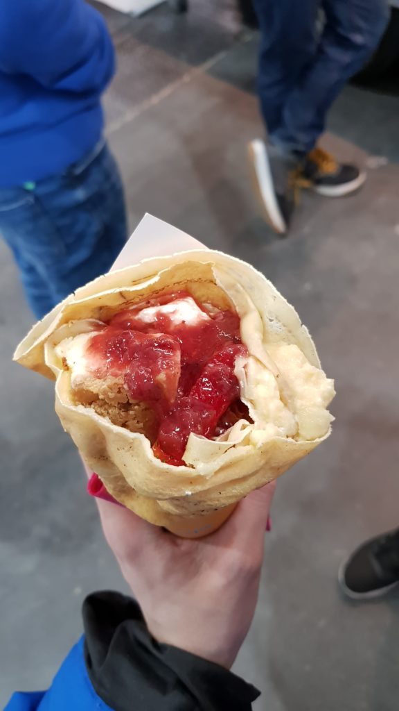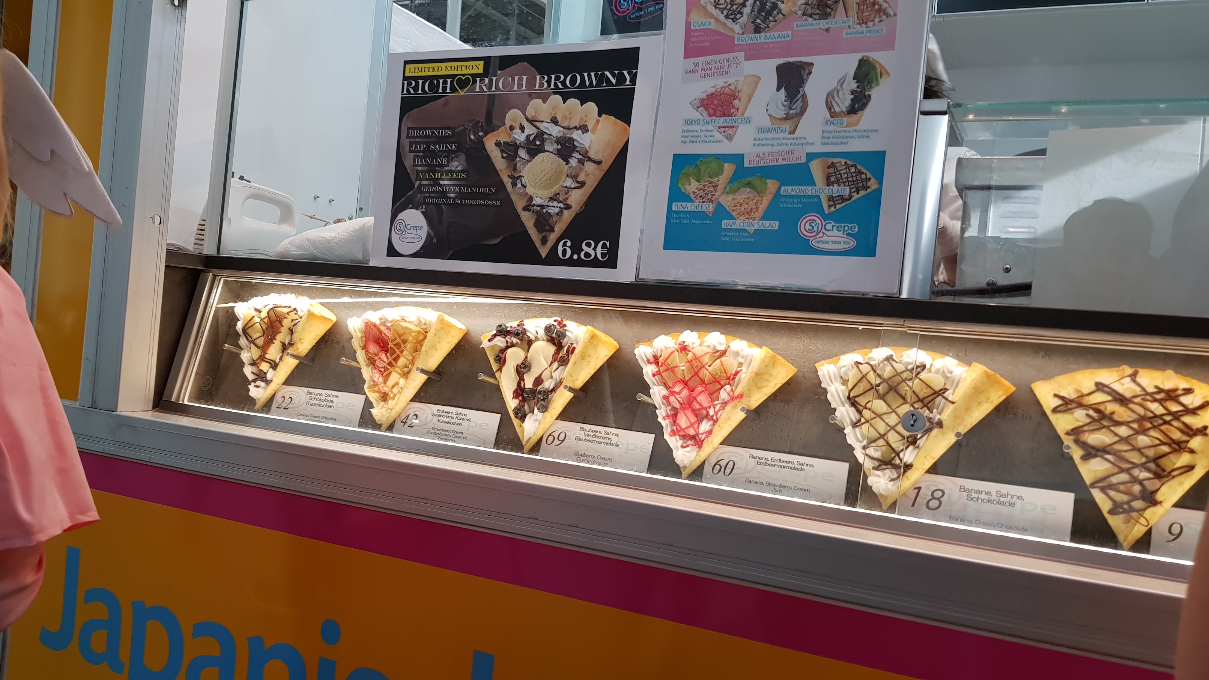 Zudem habe ich dort auch ein japanisches Crêpe probiert. Dieses haben wir im Tokyo Style bestellt, weswegen es mit Käsekuchen und Erdbeeren belegt war. Jedoch konnte man auch noch ausgefallenere Crêpes bestellen, etwa mit Teriyaki Chicken oder mit Würstchen.