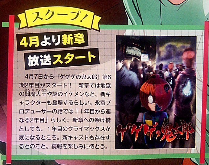 Wie nun kürzlich bekannt wurde, wird der derzeit laufende Anime ,,GeGeGe no Kitarō“ am 7. April 2019 eine zweite Staffel erhalten.