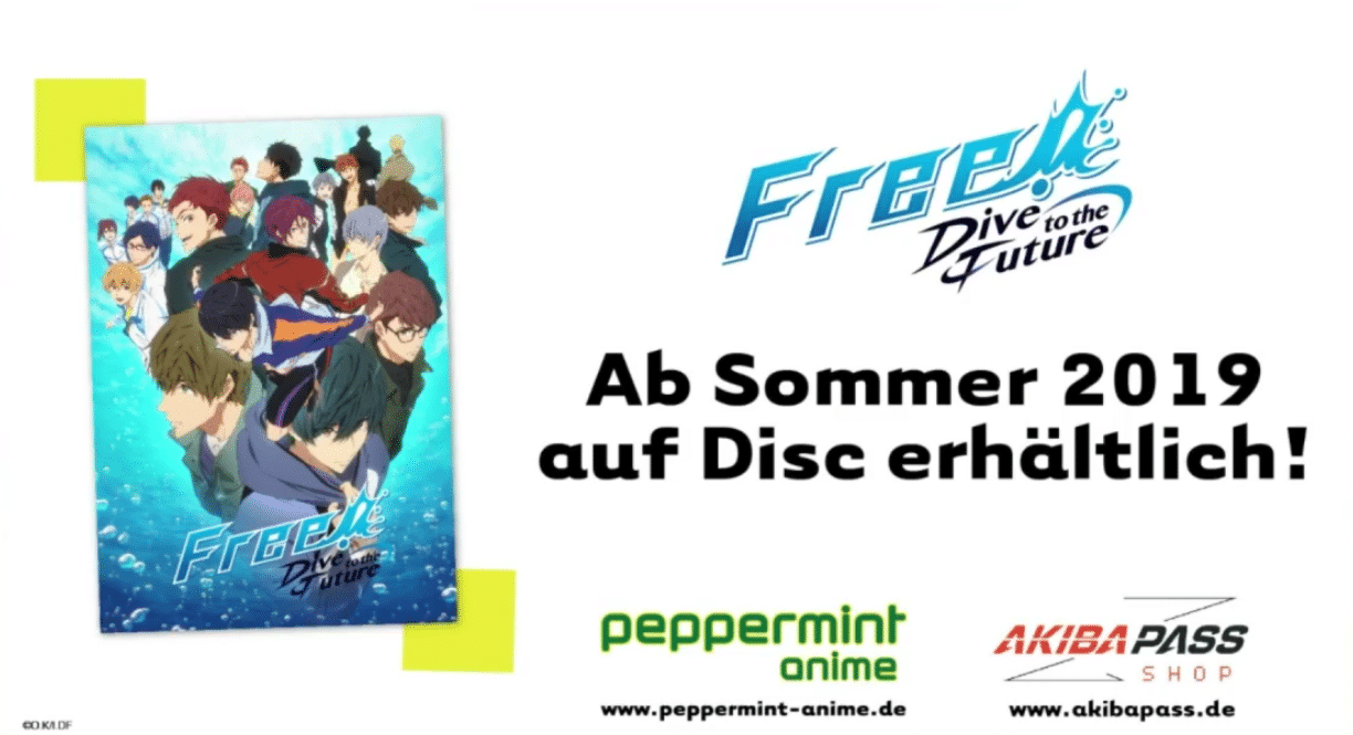 Demnach soll „Free! -Dive to the Future-“ im Sommer 2019 aufgeteilt auf zwei Volumes erscheinen. Auf der AnimagiC in Mannheim wird man Anfang August 2019 einen exklusiven Pre-Sale des ersten Volumes veranstalten, das offiziell erst danach im Handel veröffentlicht wird.