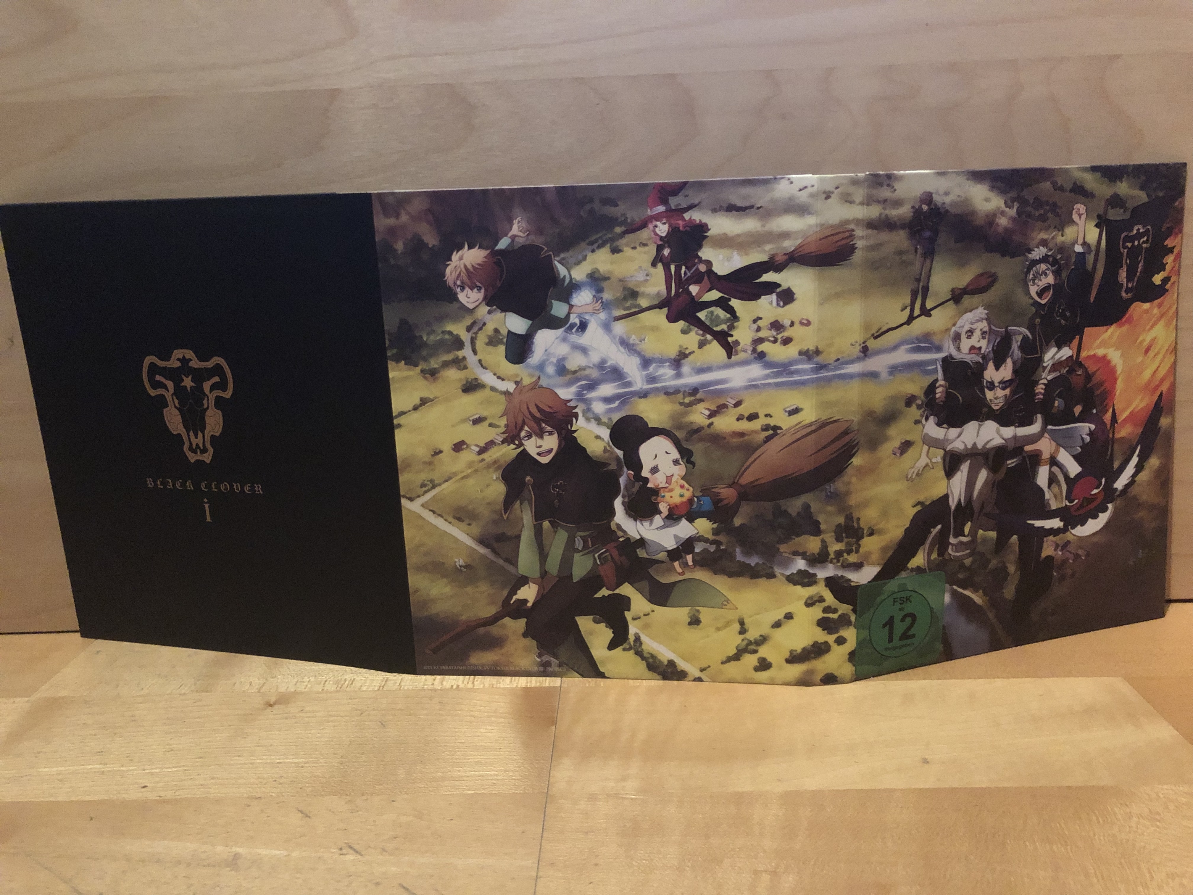 Bei der Veröffentlichung von „Black Clover“ hat sich KAZÉ dazu entschieden, auf ein Digipack im eigenen Schuber zurückzugreifen. Beim ersten Volume zeigt der Schuber dabei Protagonist Asta. Dabei wirkt er deutlich stabiler als eine einfache O-Card, kann aber in Puncto Stabilität natürlich nicht ganz mit einem Hartkarton-Sammelschuber mithalten. Auf ein aufgedrucktes FSK-Logo konnte auf dem Schuber verzichtet werden. Ein solches befindet sich dafür auf dem Digipack, das in aufgeklapptem Zustand einen großen Teil der Mitglieder des Schwarzen Stiers zeigt. Durch seine matte Oberfläche wirkt das Ganze auch haptisch edel.