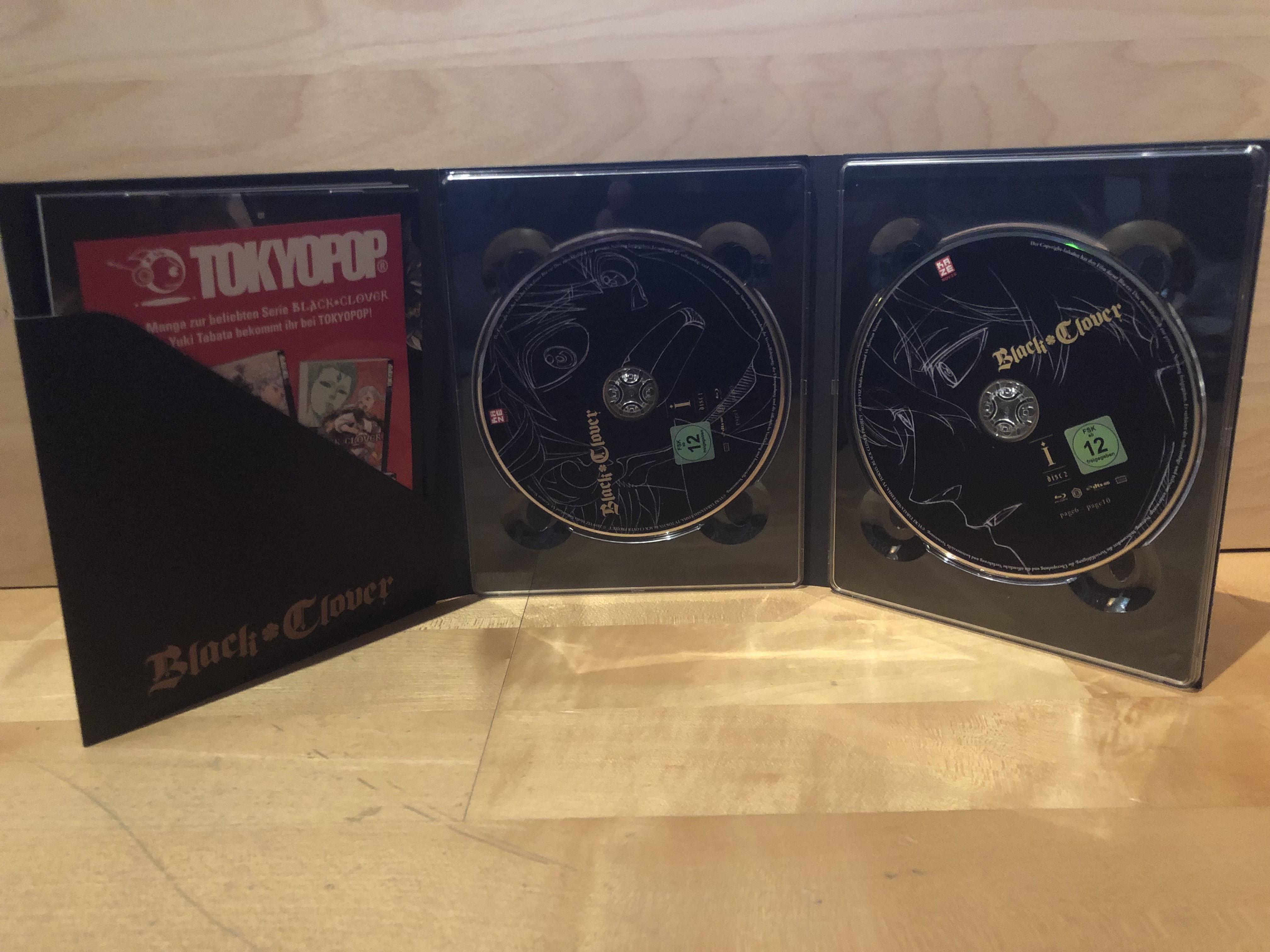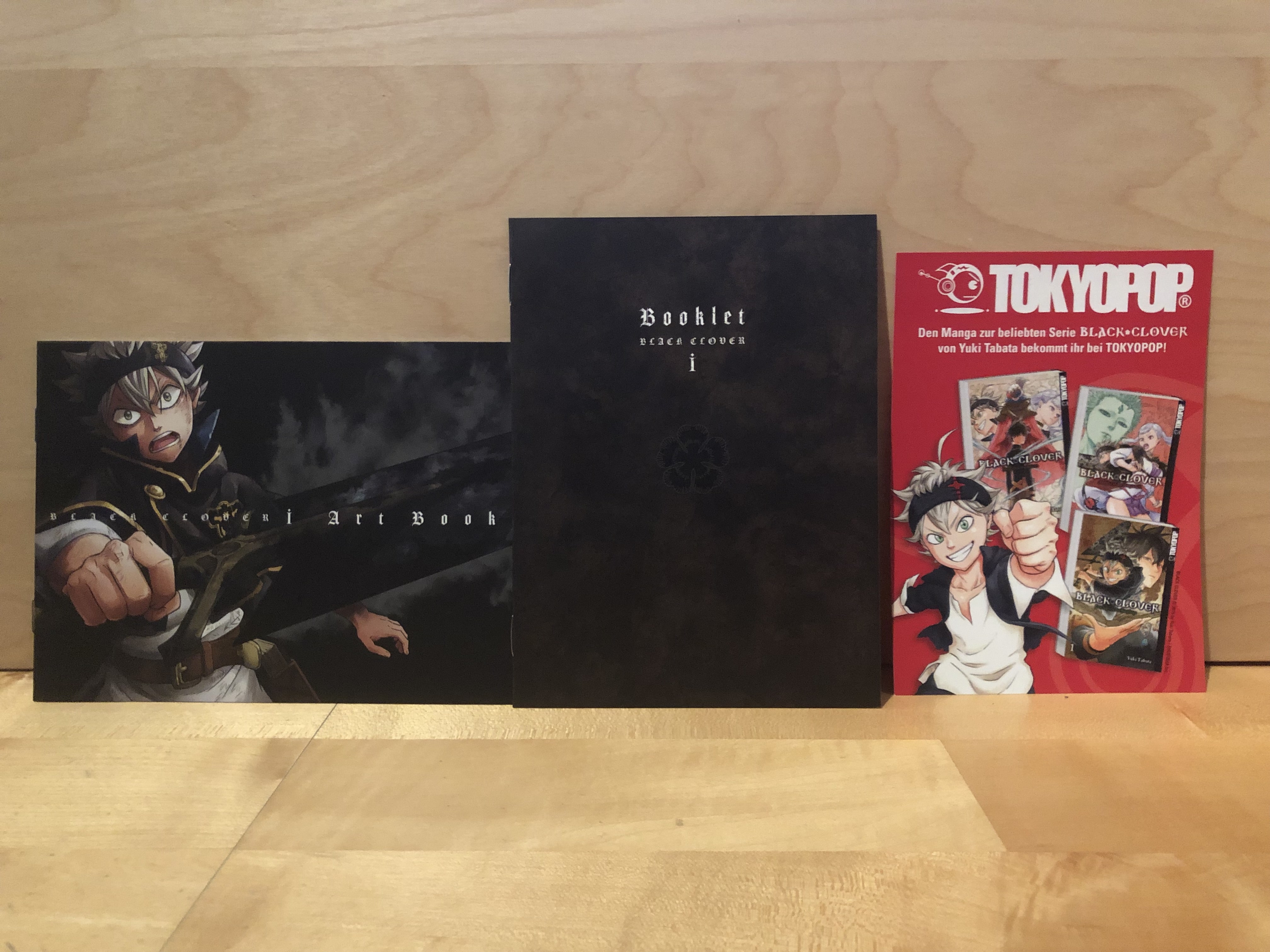 Neben einem Werbeflyer für den Manga zu „Black Clover“, der hierzulande von Tokyopop veröffentlicht wird, befinden sich im Inneren des Digipacks zudem die beiden Discs sowie zwei physische Extras – zum einen ein Booklet, das neben Infos zu Charakteren und Story des Anime auch Details zu den einzelnen Episoden enthält, sowie zum anderen ein Softcover-Artbook, das Illustrationen, Charakterdesigns und Konzeptzeichnungen umfasst. Als digitale Extras sind die kurzen „Petit Clover“-Episoden mit an Bord, die bei der TV-Ausstrahlung am Ende jeder Folge zu sehen waren.