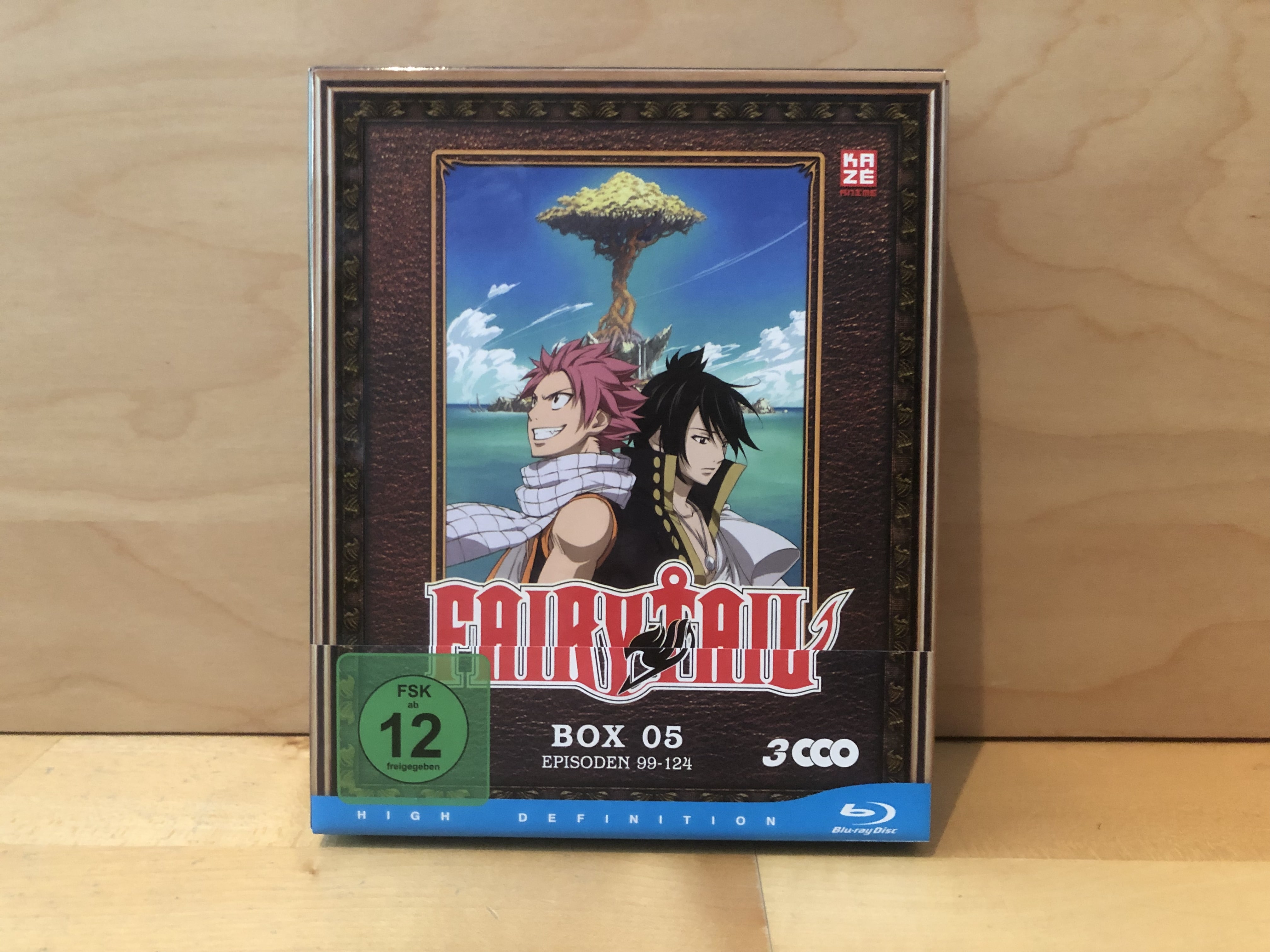 Wie aus unseren weiteren Rezensionen gewohnt, zählt die physische Aufmachung des Produkts auch diesmal nicht zur Gesamtwertung unseres Reviews. Um euch die Kaufentscheidung zu erleichtern, geben wir euch nachfolgend aber natürlich dennoch einen Überblick über das, was euch bei einem Kauf erwartet. Die nachfolgenden Informationen und Bilder beziehen sich dabei auf die Blu-Ray-Variante der fünften Box von „Fairy Tail“.