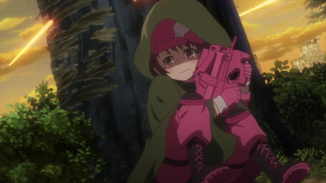 Für viele Animes eigentlich untypisch, startet „Sword Art Online Alternative – Gun Gale Online“ nach einer sehr kurzen Erklärung zur Welt des Spiels GGO direkt sehr actionreich. Als Zuschauer wird man dementsprechend in Episode 1 zunächst einmal mitten ins Geschehen hineingezogen. Dabei verfolgen wir die Perspektive des Charakters Llenn, eines kleinen Mädchens in pinker Wüstentarnkleidung, und ihres Partners M, die gemeinsam an einer Art Teamwettkampf teilnehmen. Schnell treffen die beiden dabei auf weitere Teams, deren einziges Ziel es ist, am Ende des sogenannten „Squad Jams“ – so heißt der Team-Battle-Royale – als letztes verbliebenes Team den Sieg davonzutragen.