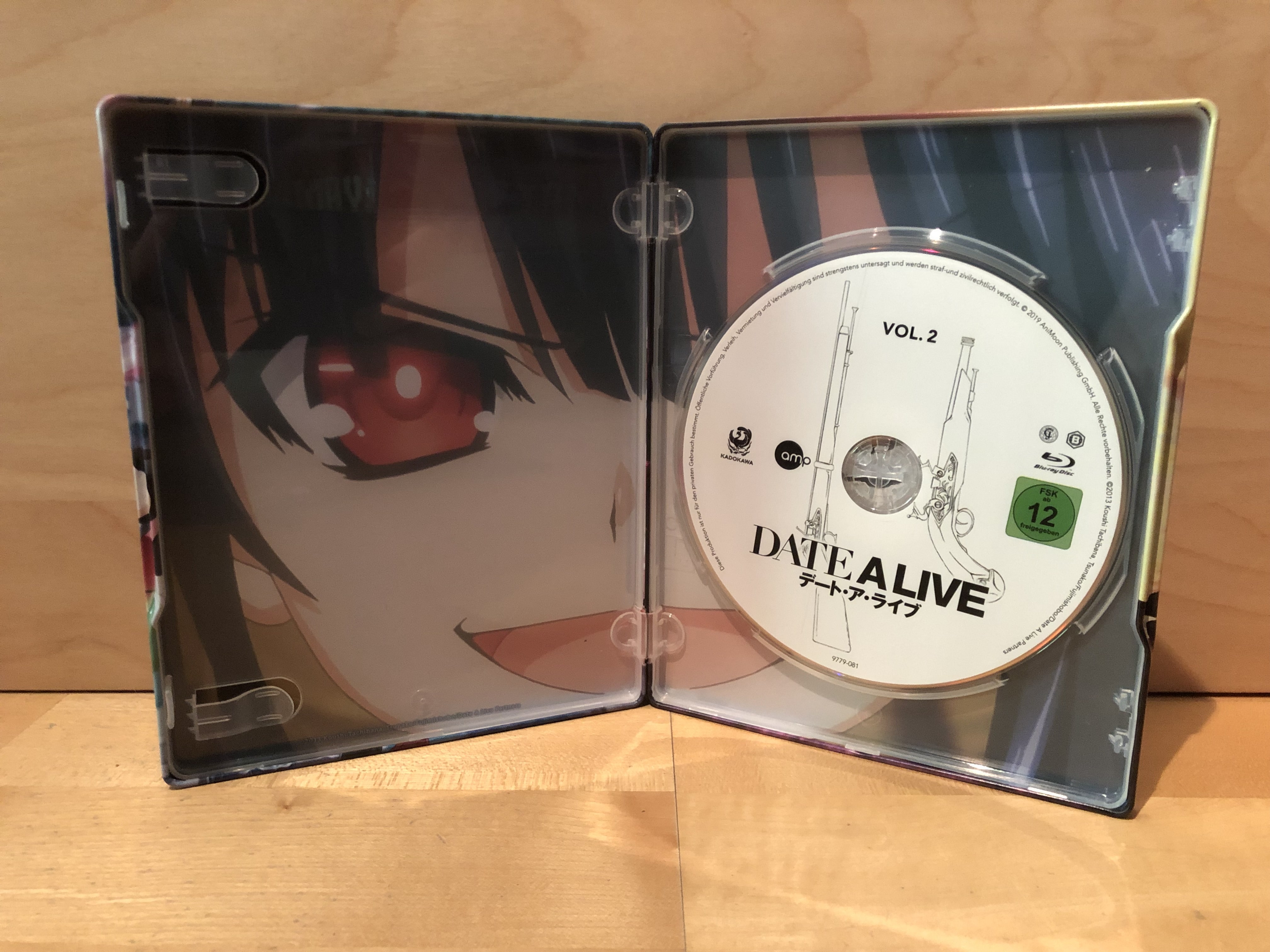Wie bereits bei Volume 1 setzt man natürlich auch diesmal wieder auf ein schickes Steelcase in einer transparenten PET-O-Card. Während auf der Front bei Volume 2 Tobiichi Origami zu sehen ist, hat es der neue Geist Kurumi auf die Rückseite des Cases geschafft. Auf ein aufgedrucktes FSK-Logo konnte wieder verzichtet werden, da sich dieses auf dem verlängerten Backflyer befindet, der ansonsten auch alle nötigen Informationen zum Inhalt des zweiten Volumes von „Date A Live“ enthält.