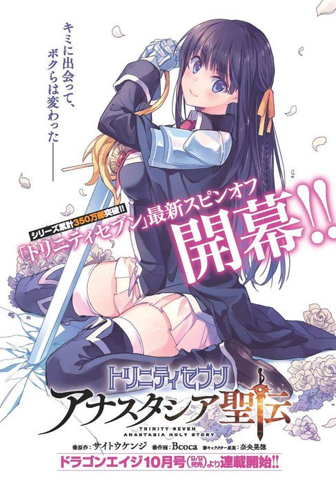 Der kommende Spinoff trägt den Titel „Trinity Seven: Anastasia Seiden“ (engl „Trinity Seven: Anastasia Holy Story“) und wird ab dem 9. September 2019 in Kadokawas „Monthly Dragon Age“-Magazin veröffentlicht.